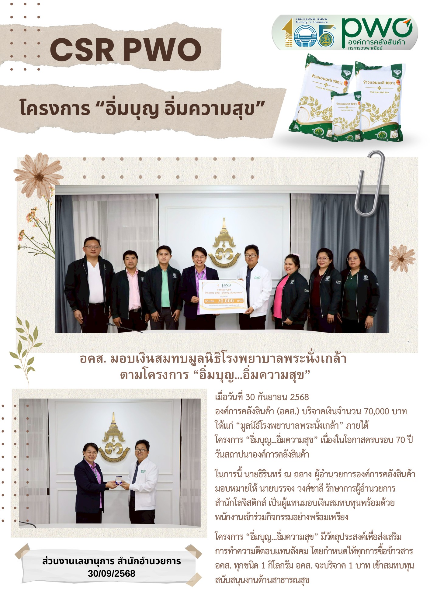 อคส.มอบเงินสมทบมูลนิธิโรงพยาบาลพระนั่งเกล้า ตามโครงการ "อิ่มบุญ...อิ่มความสุข"