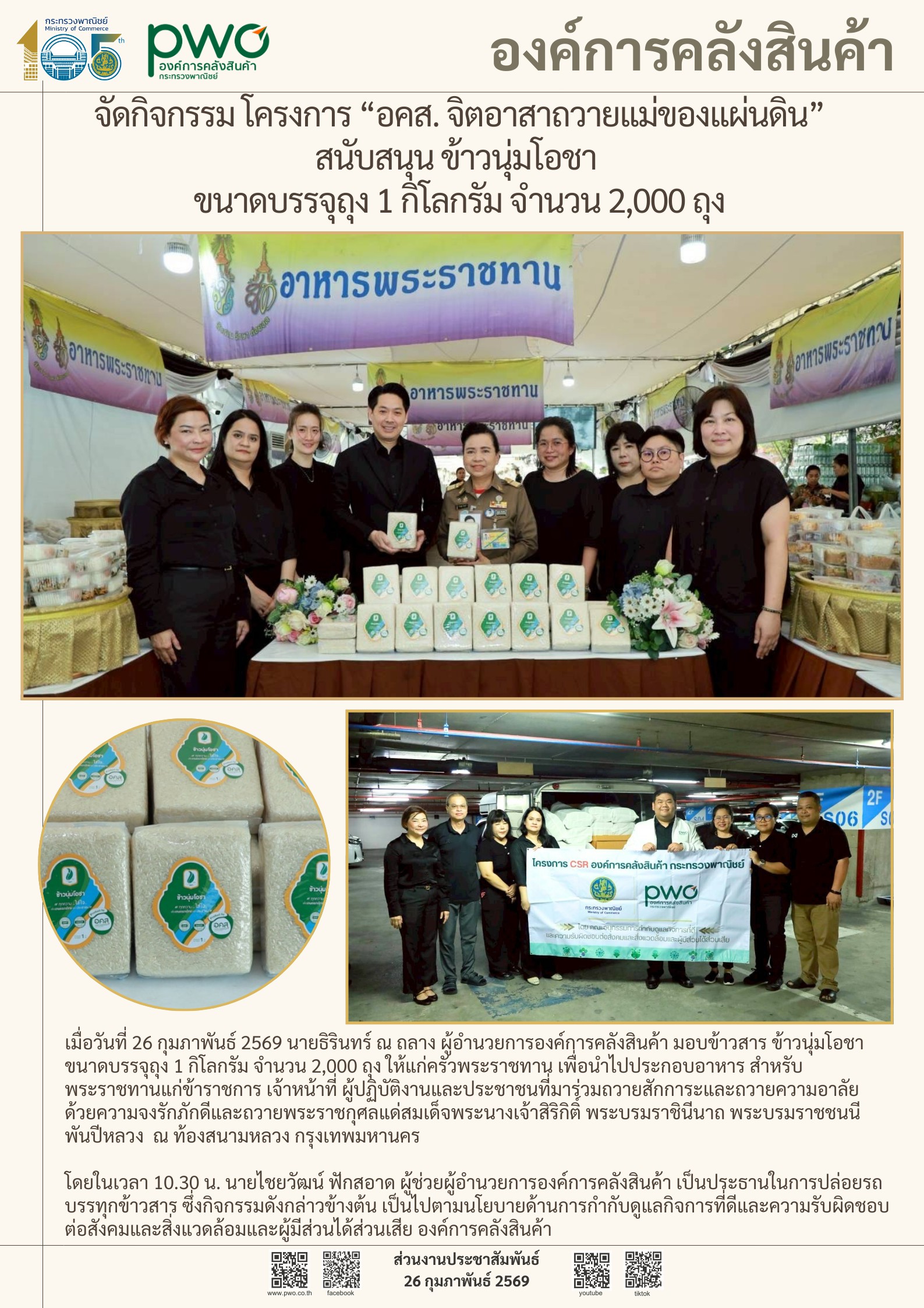 องค์การคลังสินค้า จัดกิจกรรม "โครงการ อคส. จิตอาสาถวายแม่ของแผ่นดิน" สนับสนุนข้าวสาร ข้าวนุ่มโอชา ขนาดบรรจุถุง 1 กิโลกรัม จำนวน 2,000 ถุง