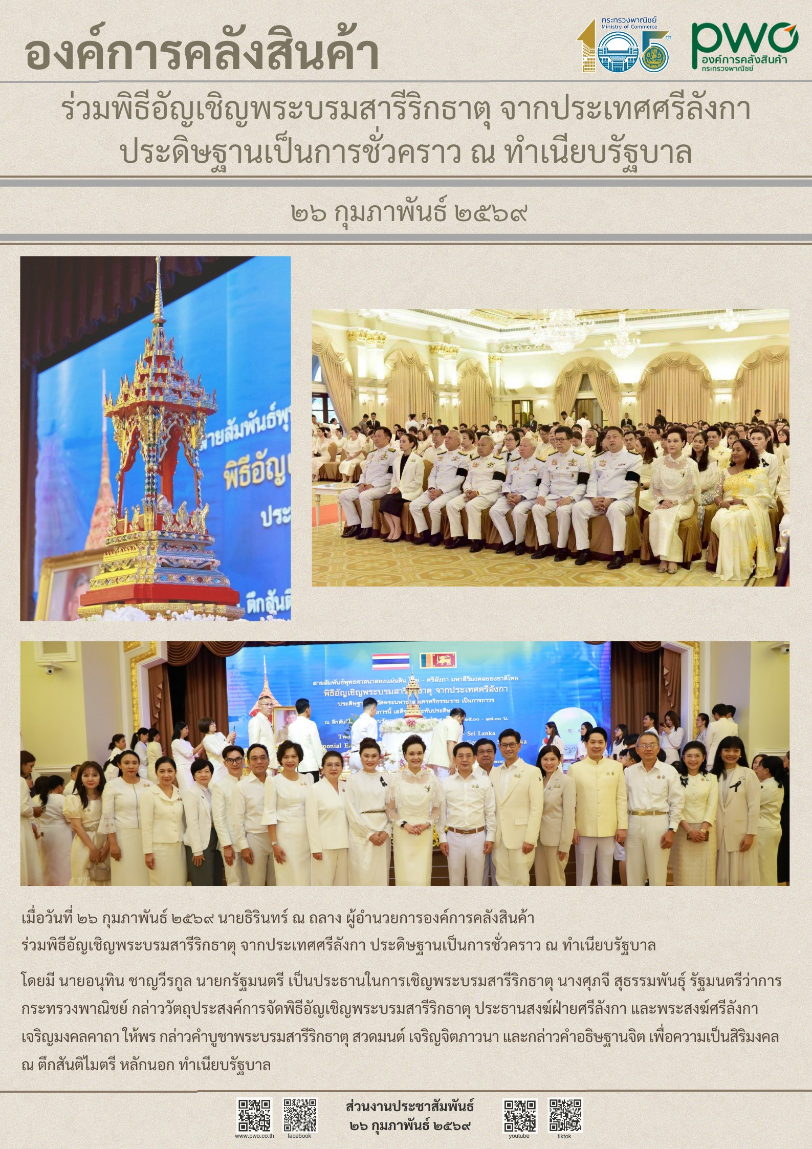 องค์การคลังสินค้า ร่วมพิธีอัญเชิญพระบรมสารีริกธาตุ จากประเทศศรัลังกา ประดิษฐานเป็นการชั่วคราว ณ ทำเนียบรัฐบาล